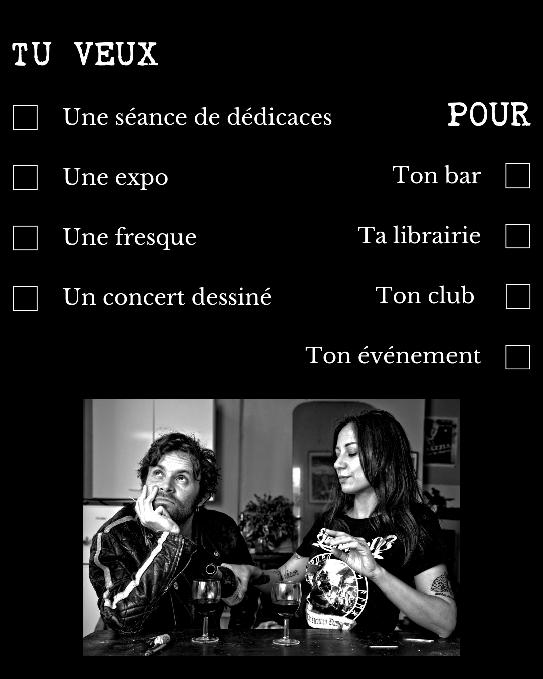 Les Blouson Noirs c’est nous, Sofie VON KELEN, journaliste spécialisée rock & BD et Johann GUYOT, auteur de bandes-dessinées. Depuis 8 ans, nous créons et éditont la série Welcome to Hell(fest) – Le Hellfest en BD reportage (3 volumes et une intégrale).
