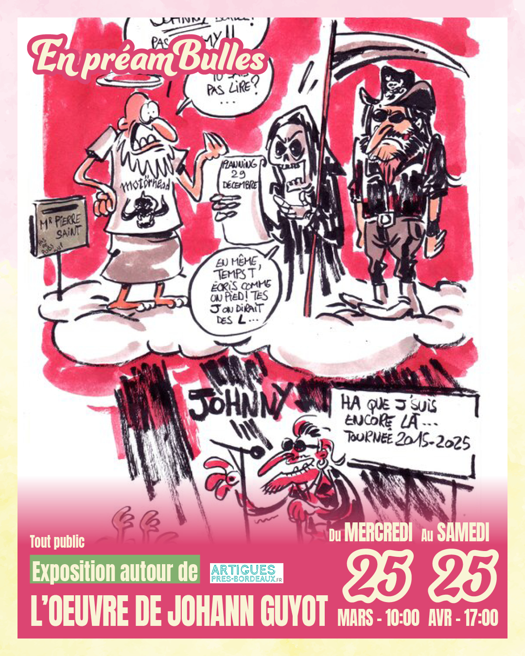 Several books are currently in progress: « VIBRATIONS – Complementary viewpoints about Jazz and Metal » a documentary comics crossing J. GUYOT & A LEGALLOCH perspectives about jazz and metal, an illustrated collection of annecdotes about metal by J. GUYOT, an artbook of J. GUYOT reinterpreting famous metal artworks in a kids art style and a collection of illustrated documentaries about rock patrimony of major french cities.